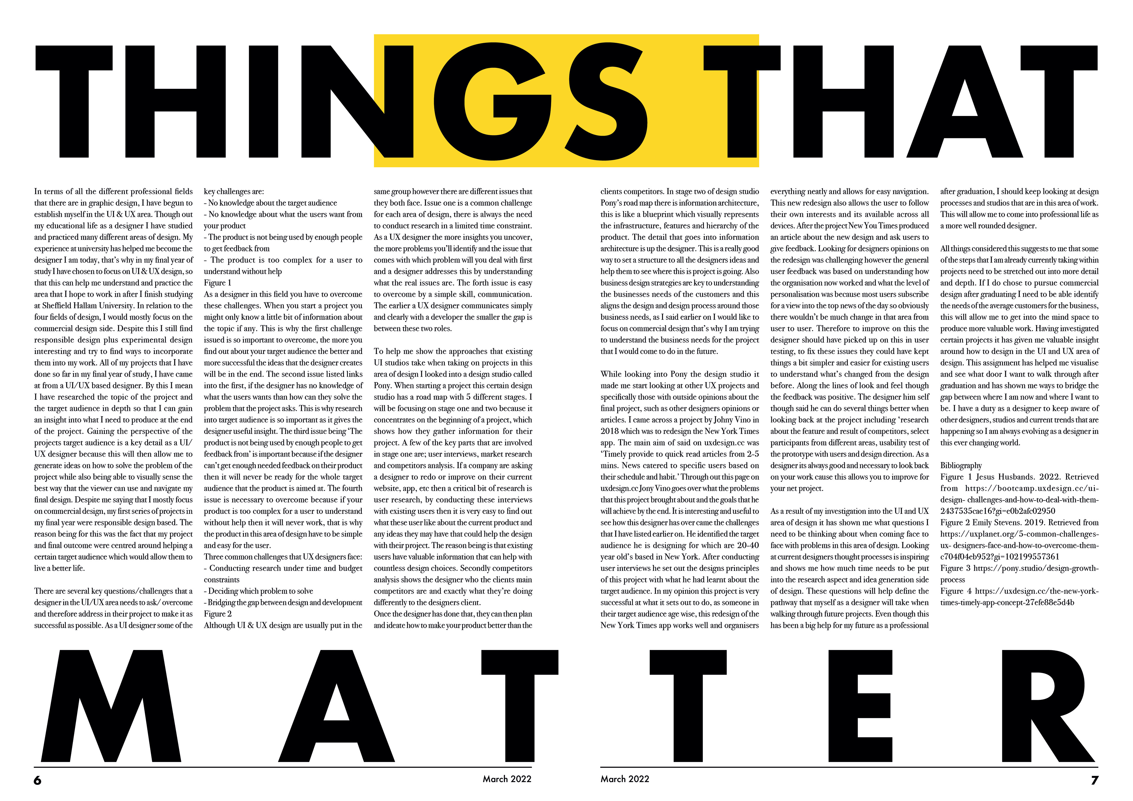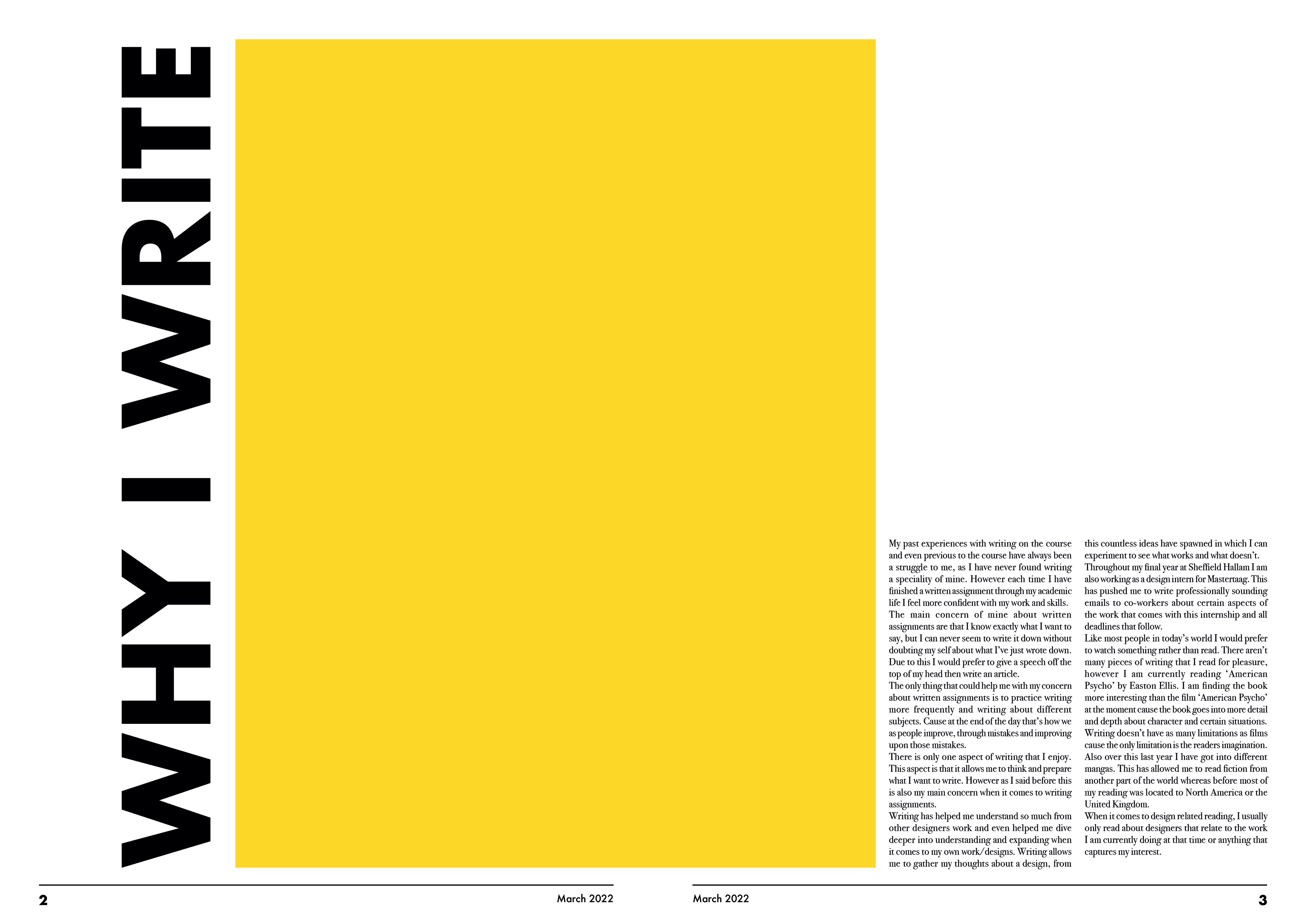 I set out to create a short magazine that includes a double-page spread for the three pieces of writing I
